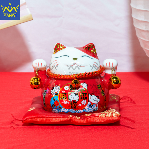 Mèo Thần Tài Khai Vận Phát Tài – Đỏ mang ý nghĩa phong thủy đặc biệt, theo quan niệm dân gian Nhật Bản, Mèo Thần Tài được coi là thần tài mang lại may mắn, tài lộc, sức khỏe và hạnh phúc cho gia chủ. Với các họa tiết mèo con trên thân mèo tượng trưng cho sự đủ đầy, thêm vào đó là biểu tượng đồng tiền với các chữ “Nguồn ngân sách cuồn cuộn”