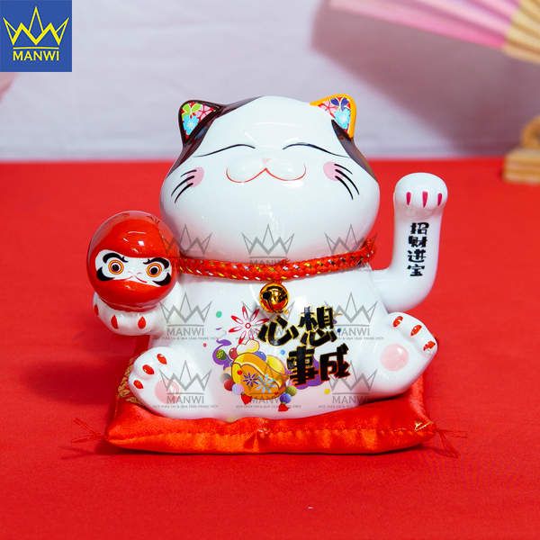 Mèo Thần Tài Tâm Tưởng Sự Thành là vật phong thủy có nguồn gốc đến từ Nhật Bản. Ở đây người ta gọi là Maneki-neko, dùng để ám chỉ những chú mèo gốm sứ có khả năng mang lại may mắn cho con người. Có nguồn gốc từ đất nước có tín ngưỡng cao, mèo thần tài dần trở thành một món đồ không thể thiếu cho những ai đang muốn làm kinh doanh. Vì nó có thể chiêu tài lộc cũng như may mắn đến cho con người. Là món đồ phong thủy giá trị nên Manwi luôn cẩn thận, đảm bảo chất lượng đến với khách hàng. Ngoài ra, mèo thần tài còn được tặng kèm theo chiếc hộp rất xinh; chiếc hộp có những hoa văn thích hợp để làm quà tặng trong những dịp đặc biệt.